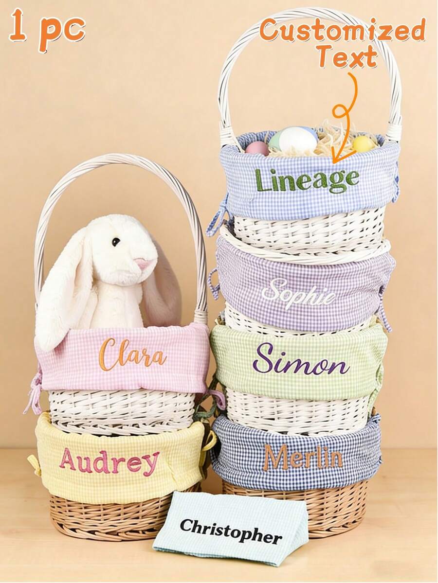 1 pieza Forro de cesta de Pascua de algodón de guinga bordado con nombre personalizado, cesta de mimbre