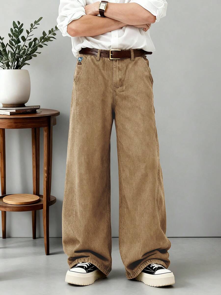 1 pieza Pantalones vaqueros anchos de corte holgado de estilo retro americano para hombre, color marrón, con bordado de elefante de dibujos animados, unisex (cinturón y accesorios no incluidos)
