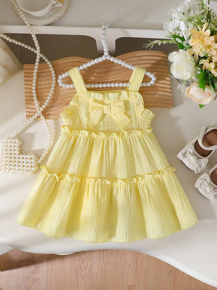 Vestido de línea A con volantes y lazo de tirantes finos para niñas, adecuado para salidas diarias, primavera/verano
