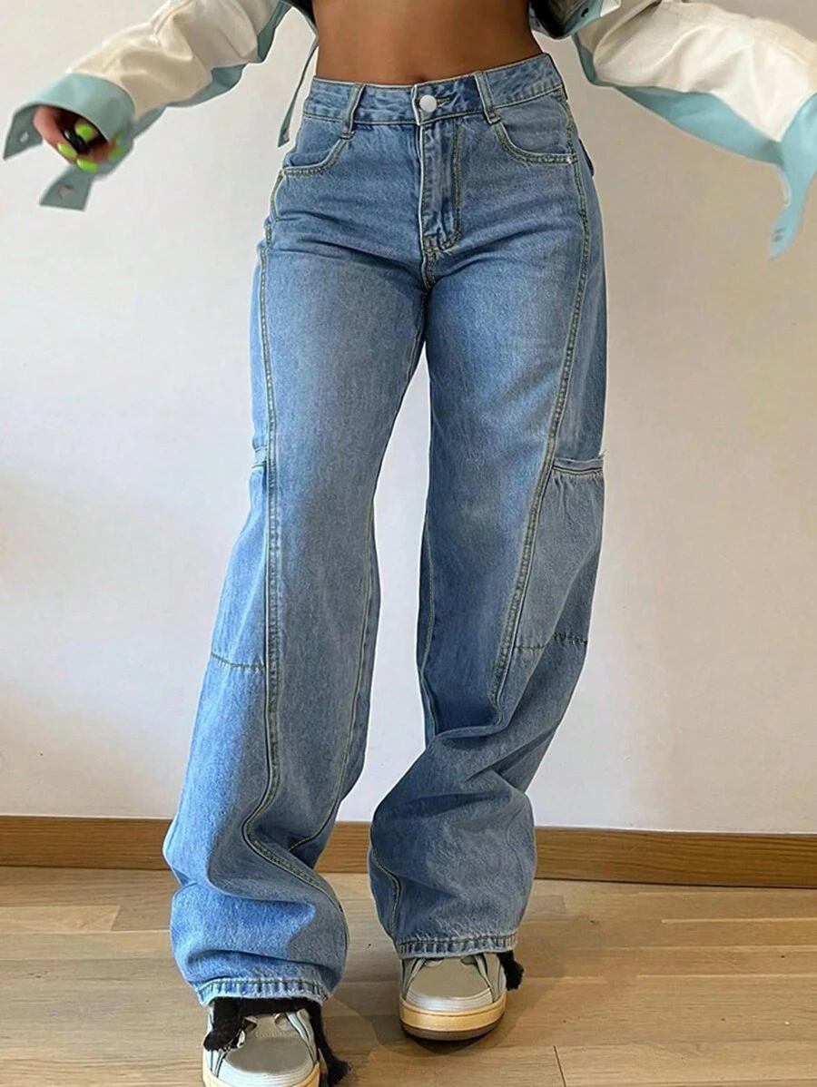 Pantalones rectos de mezclilla para mujer con efecto de empalme al estilo novio