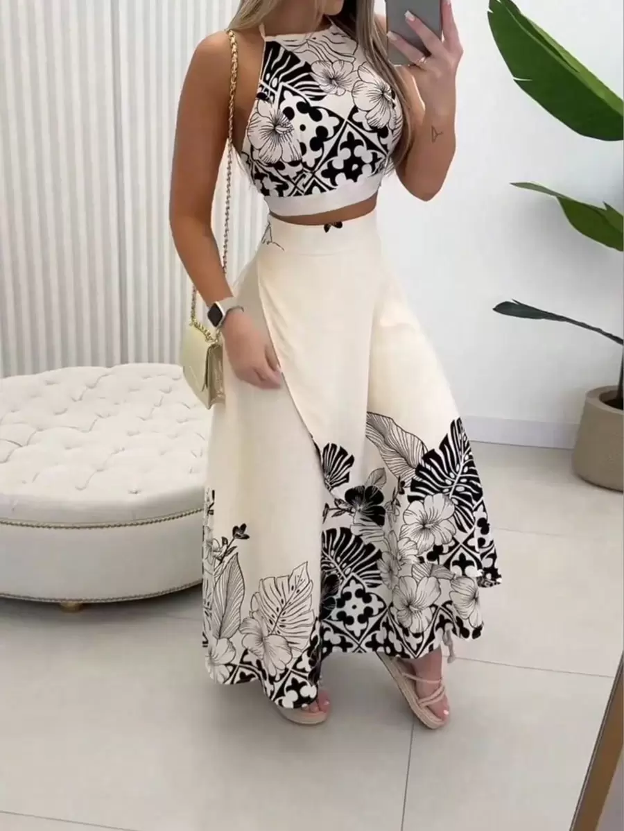 Breezaya Conjunto de 2 piezas de estilo vacacional con top tipo halter estampado con flores y plantas y falda con abertura lateral envuelta