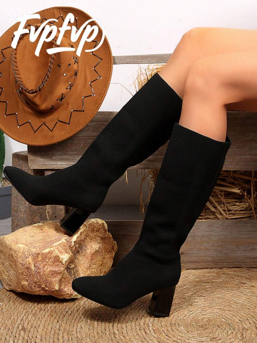 FVPFVP Botas hasta la rodilla de punta cuadrada, botas de montar con tacón grueso ajustado para mujer, para otoño, invierno y fiestas