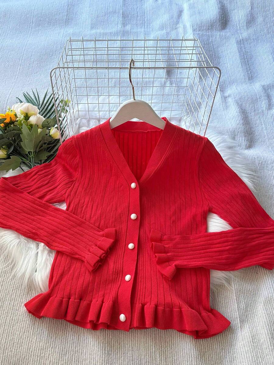 Elegante y de moda Cárdigan de punto a cuadros con escote en V para mujer en otoño-invierno - Mangas largas, longitud corta, bordes con volantes, cierre con botones delanteros. Adecuado para Acción de Gracias, Navidad, Año Nuevo y otras ocasiones.