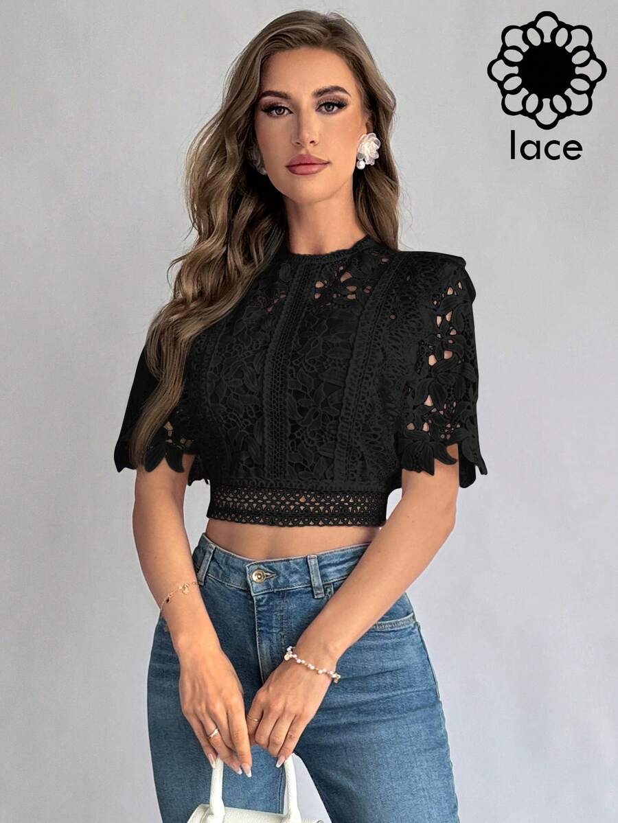 Firerie Camiseta de verano para mujer de encaje transparente con camisa, top de manga corta