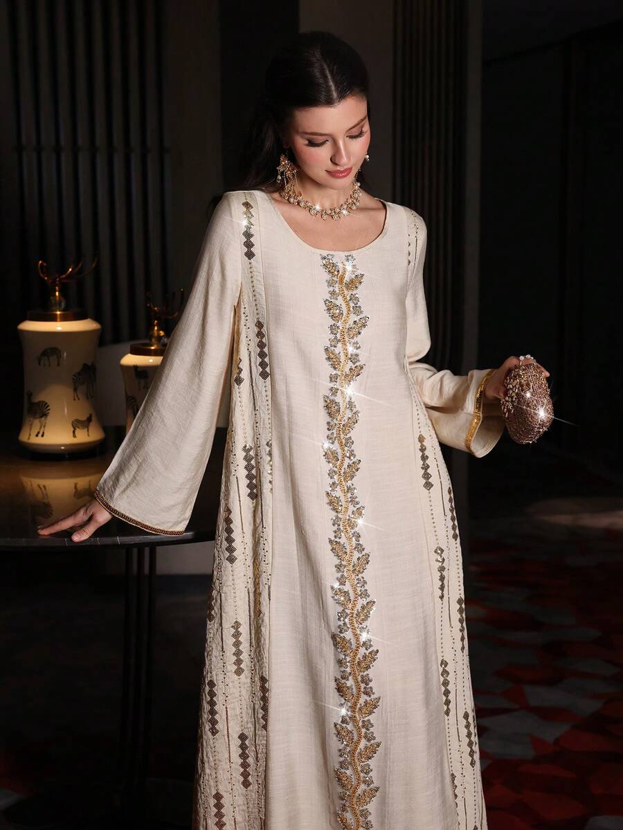 Layrah Vestido elegante de manga larga acampanada con cuello redondo, bordado y con cuentas, para primavera/verano
