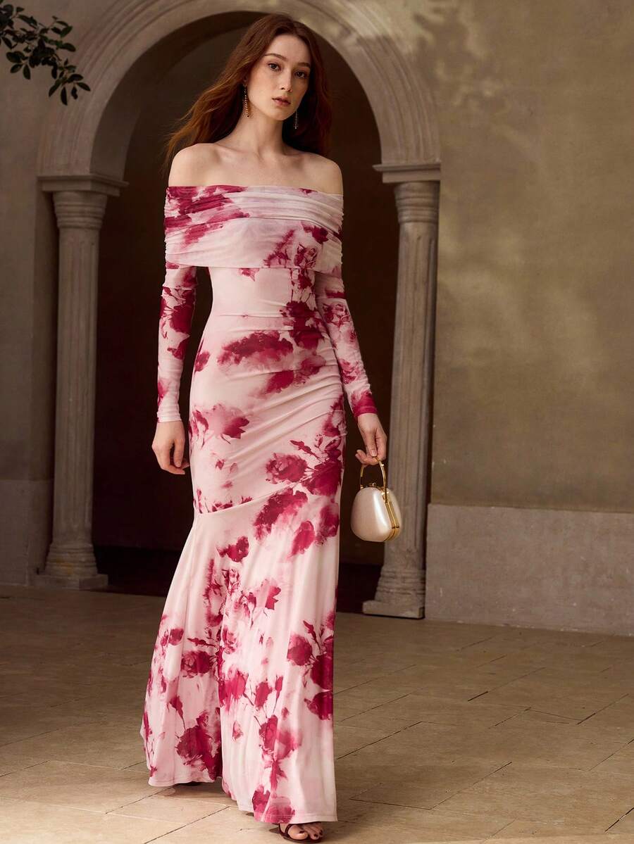 MOTF PREMIUM VESTIDO DE PUNTO LARGO CON HOMBROS DESCUBIERTOS Y ESTAMPADO DE MALLA PARA MUJER, PRIMAVERA/VERANO