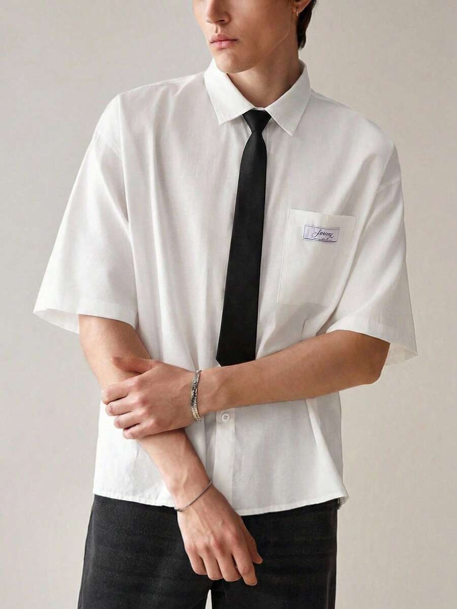 Manfinity Unisex Camisa de bolsillo de manga corta con estampado de letras y de una sola de botones para hombre