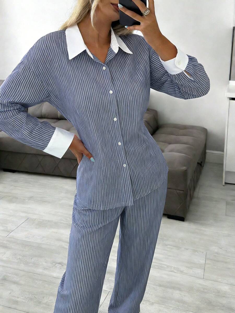 Nina Bonheur 2 piezas Conjunto de pijama de mujer con camisa de manga larga con botones y rayas + pantalones con cintura con cordón, conjunto de ropa de dormir linda