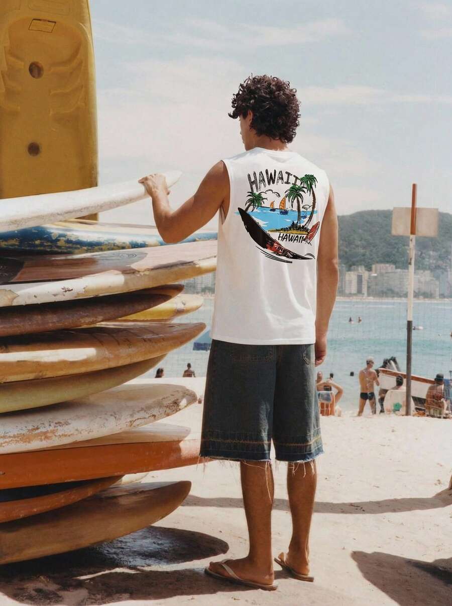 Open Phase Camiseta de tirantes casual de cuello redondo para hombres con estampado de árboles de coco y surf, adecuada para vacaciones en la playa y uso diario, de verano a primavera