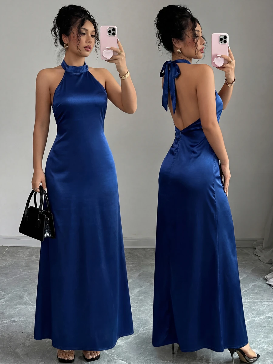 Vestido de satén ajustado con escote halter y espalda descubierta, elegante y romántico para fiesta y vacaciones