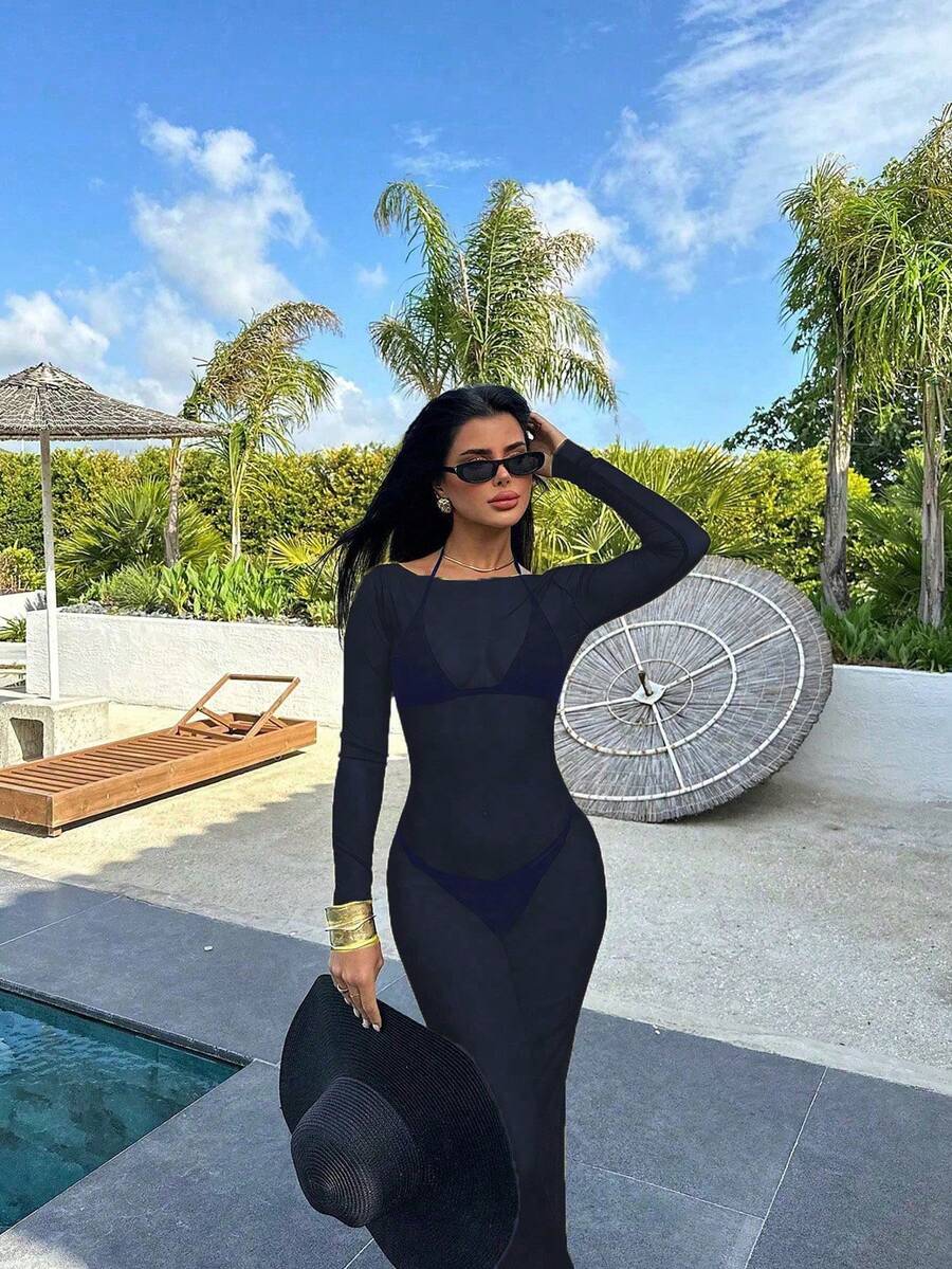 Vestido de verano para mujer sexy de malla transparente con hombros descubiertos y manga larga tipo ajustado