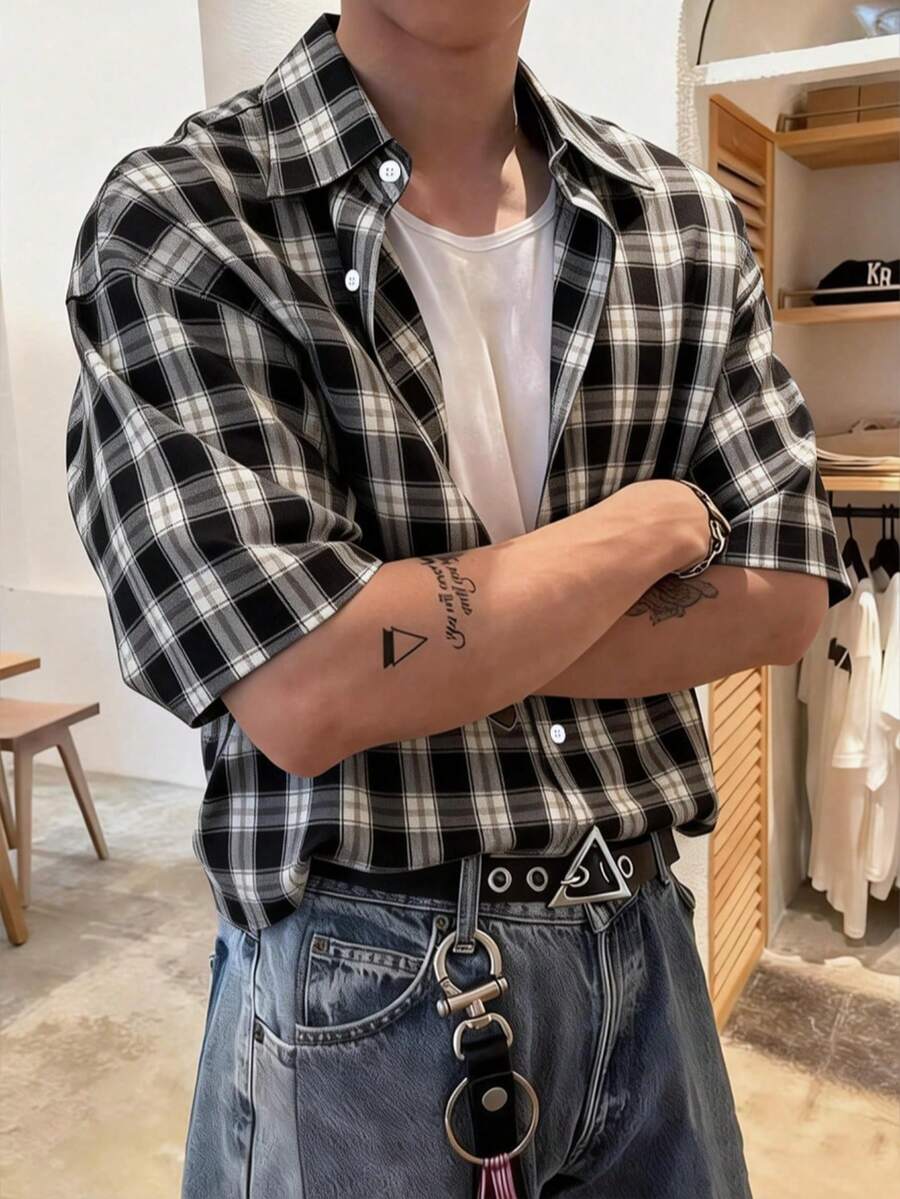 WAIT HIM Camisa casual de manga corta con botones delanteros a cuadros para hombre, de verano