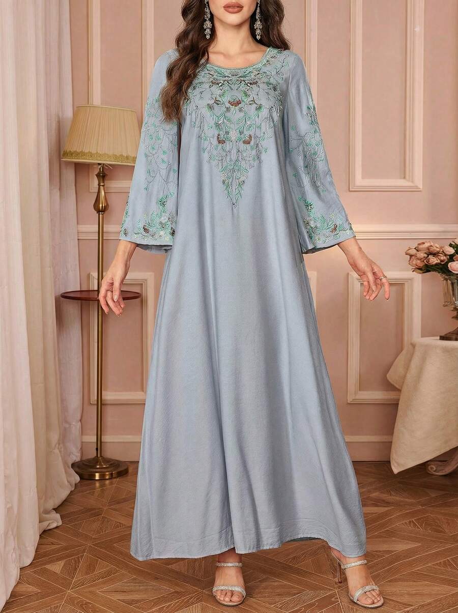Solessence Vestido árabe elegante de cuello redondo con bordado y perlas de burbujas para uso diario