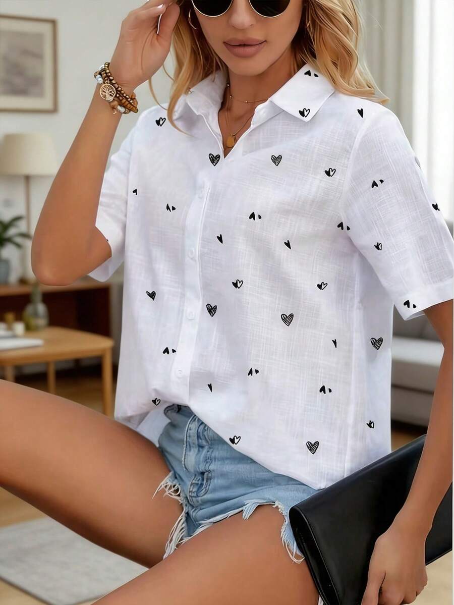 Blusa de mujer de manga corta con cuello de camisa, estampado de corazón, botones delanteros y bajo regular en tela tejida