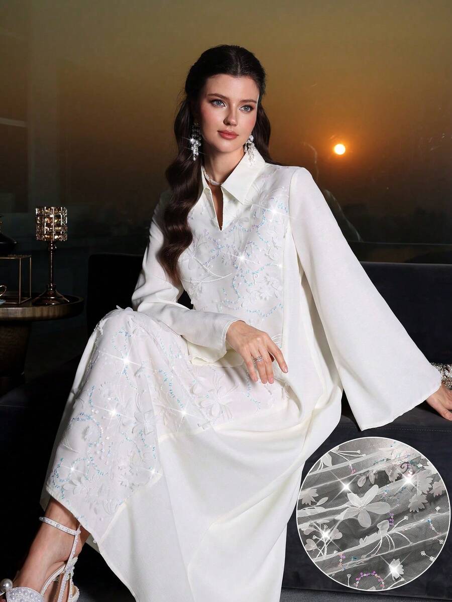 Yasmyna Vestido de unicolor con textura, bordado con lentejuelas y cuello alto